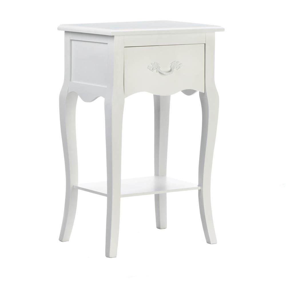 • This romantic country nightstand fits nicely anywhere, whether it's tucked next to your bed, or in the children's room. Featuring one drawer and a lower open shelf, this table's white finish makes a timeless addition to your space.